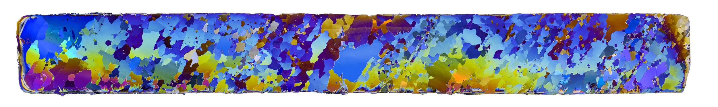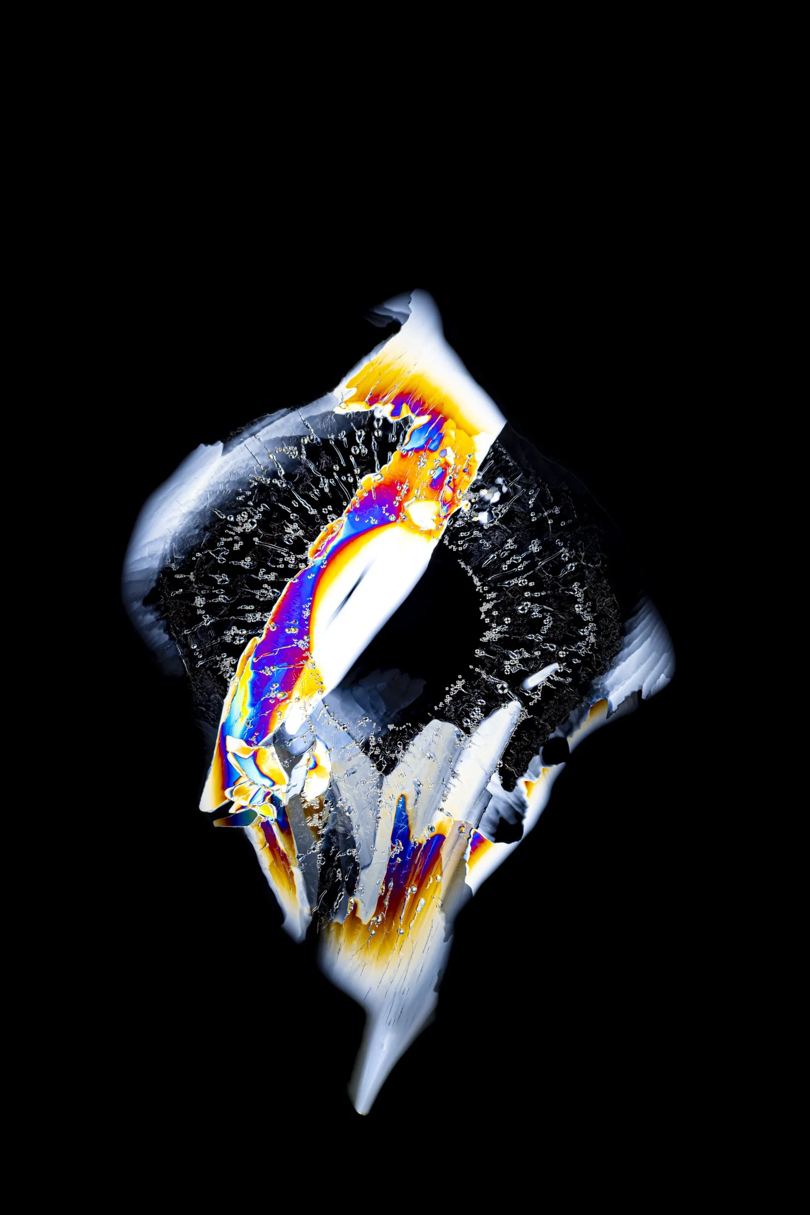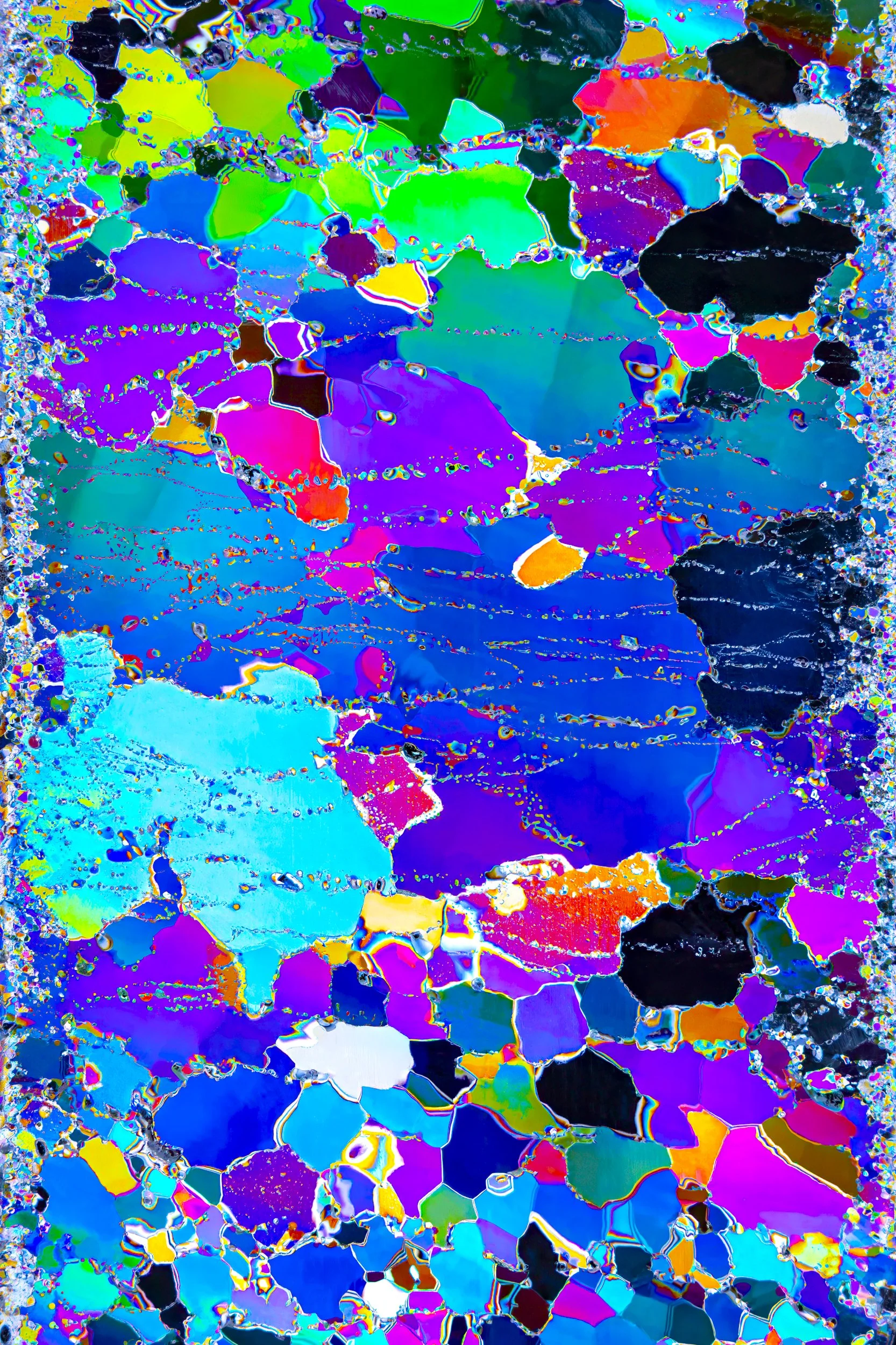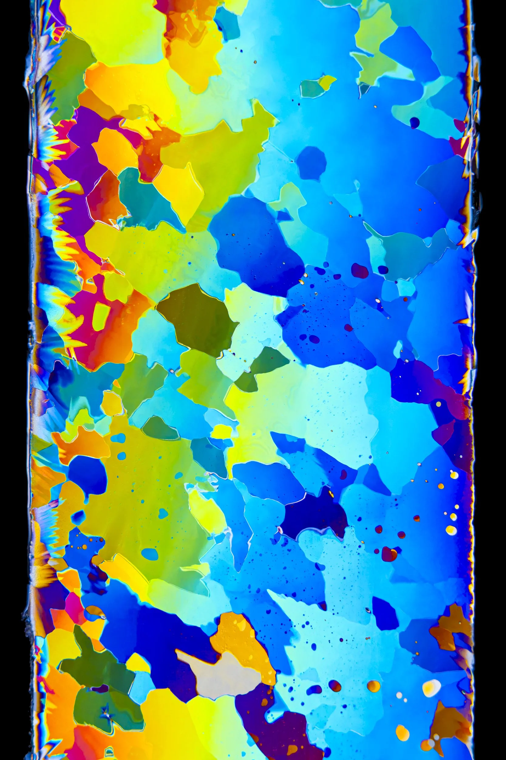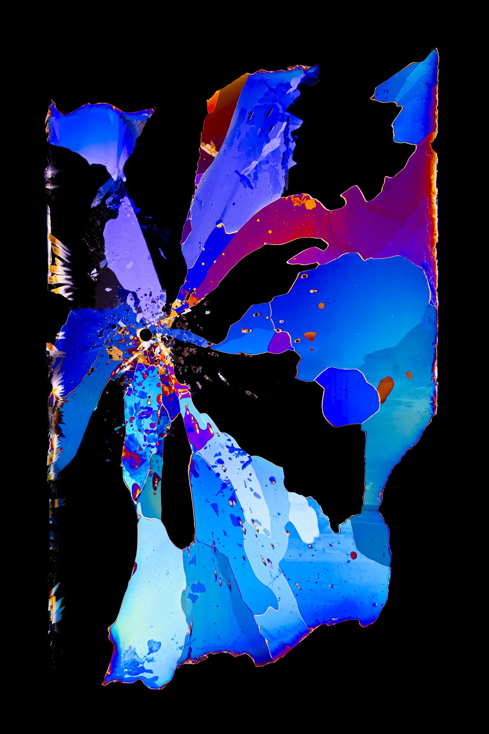 The abstract and colourful photographs show thin sections of ancient glacier ice and ultra pure water ice under cross polarised light.