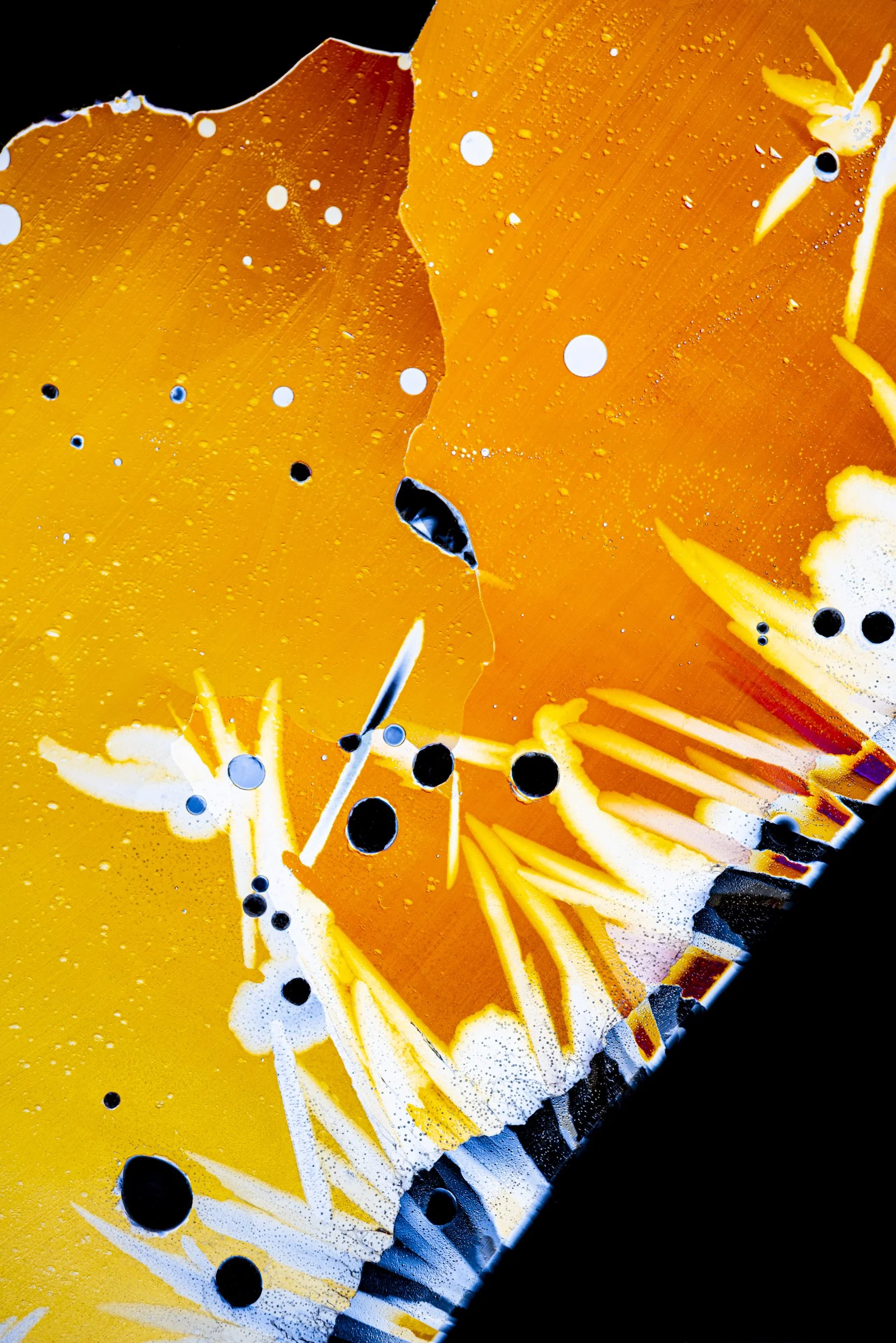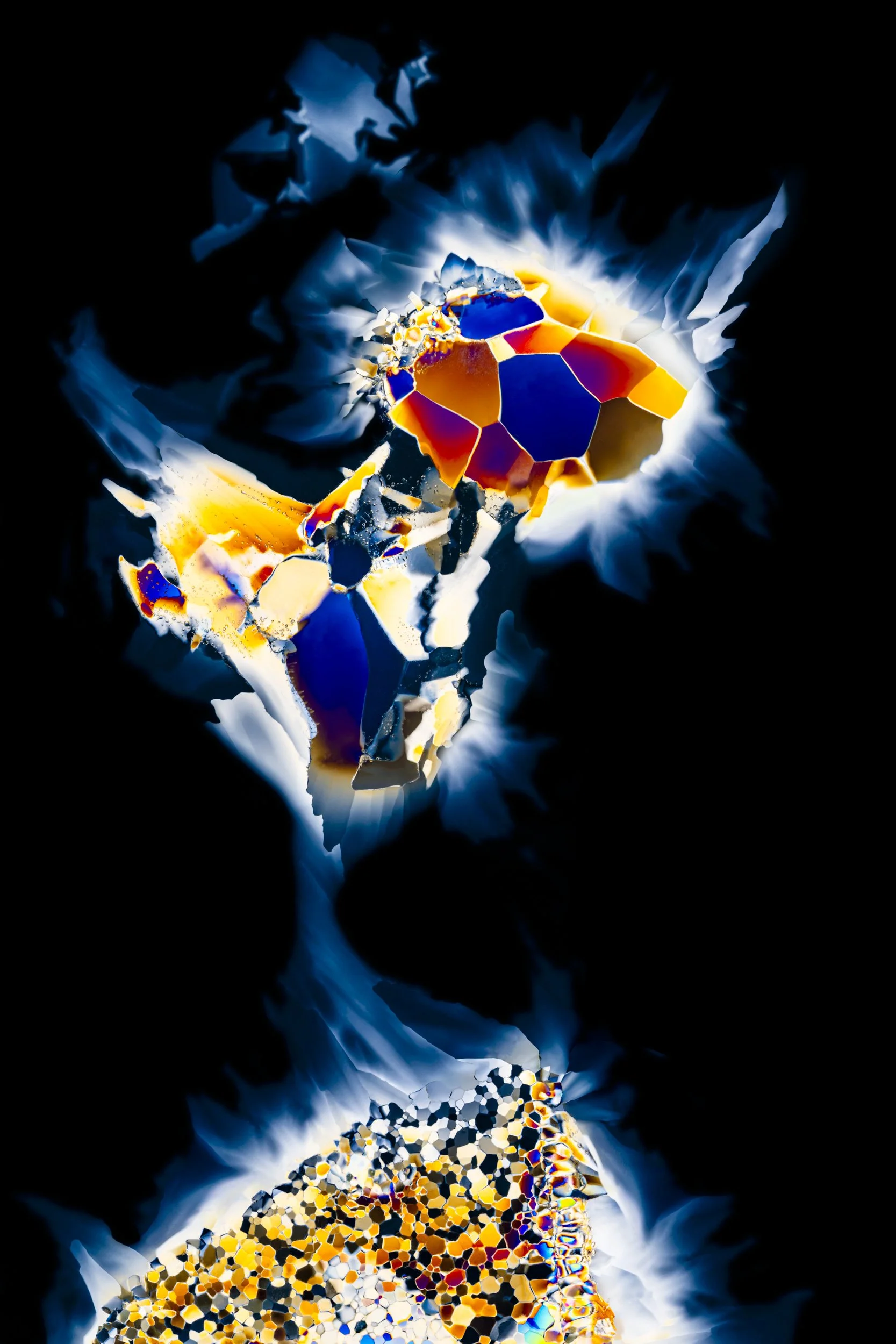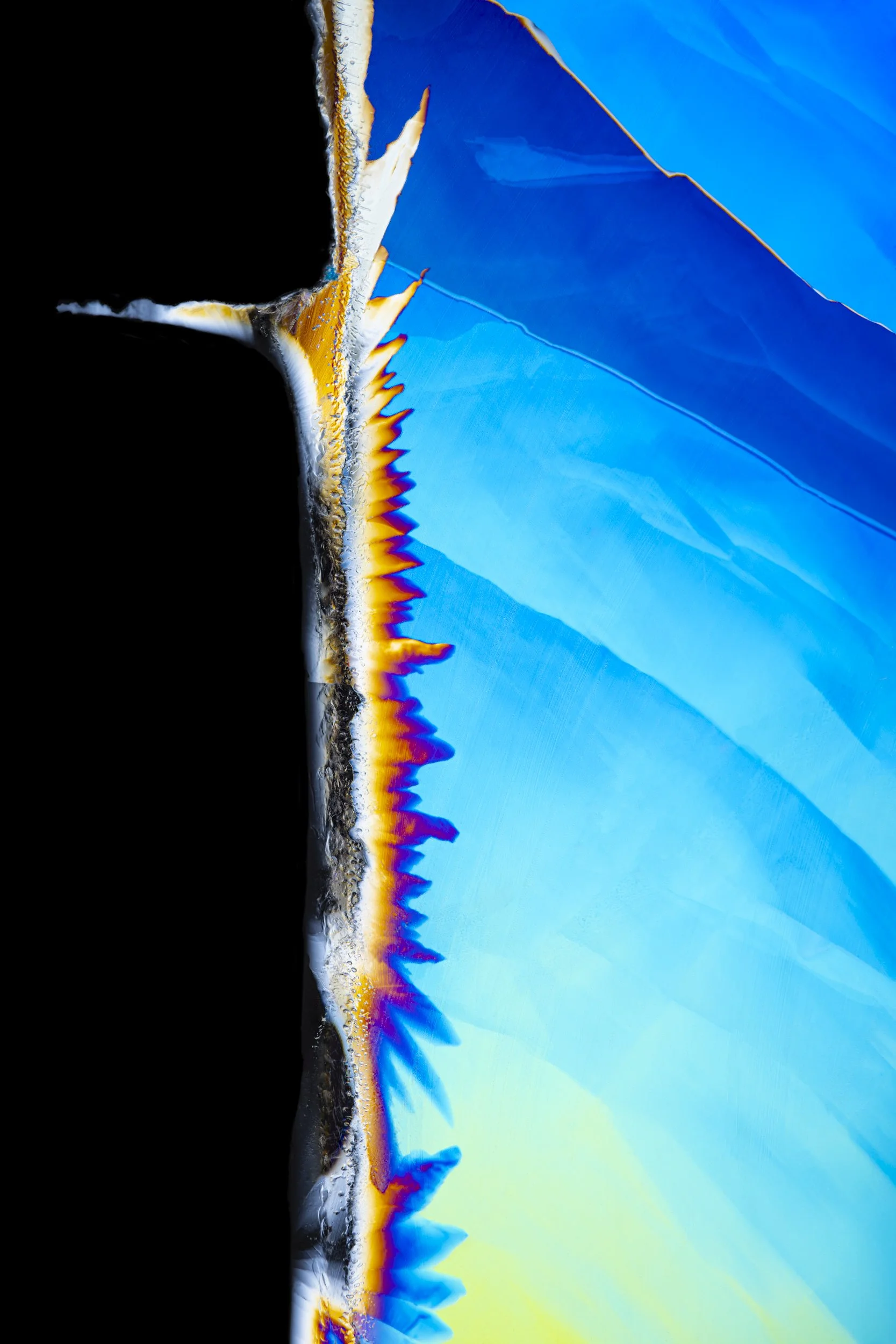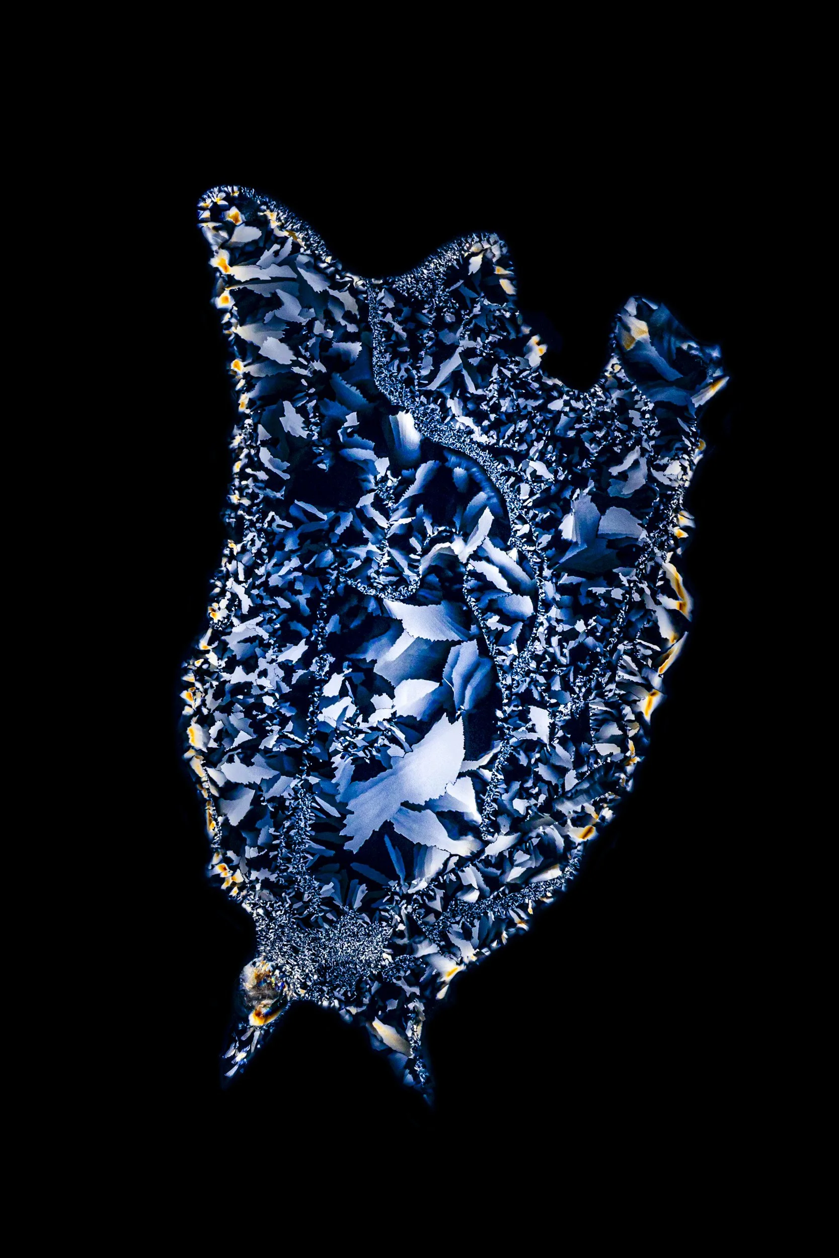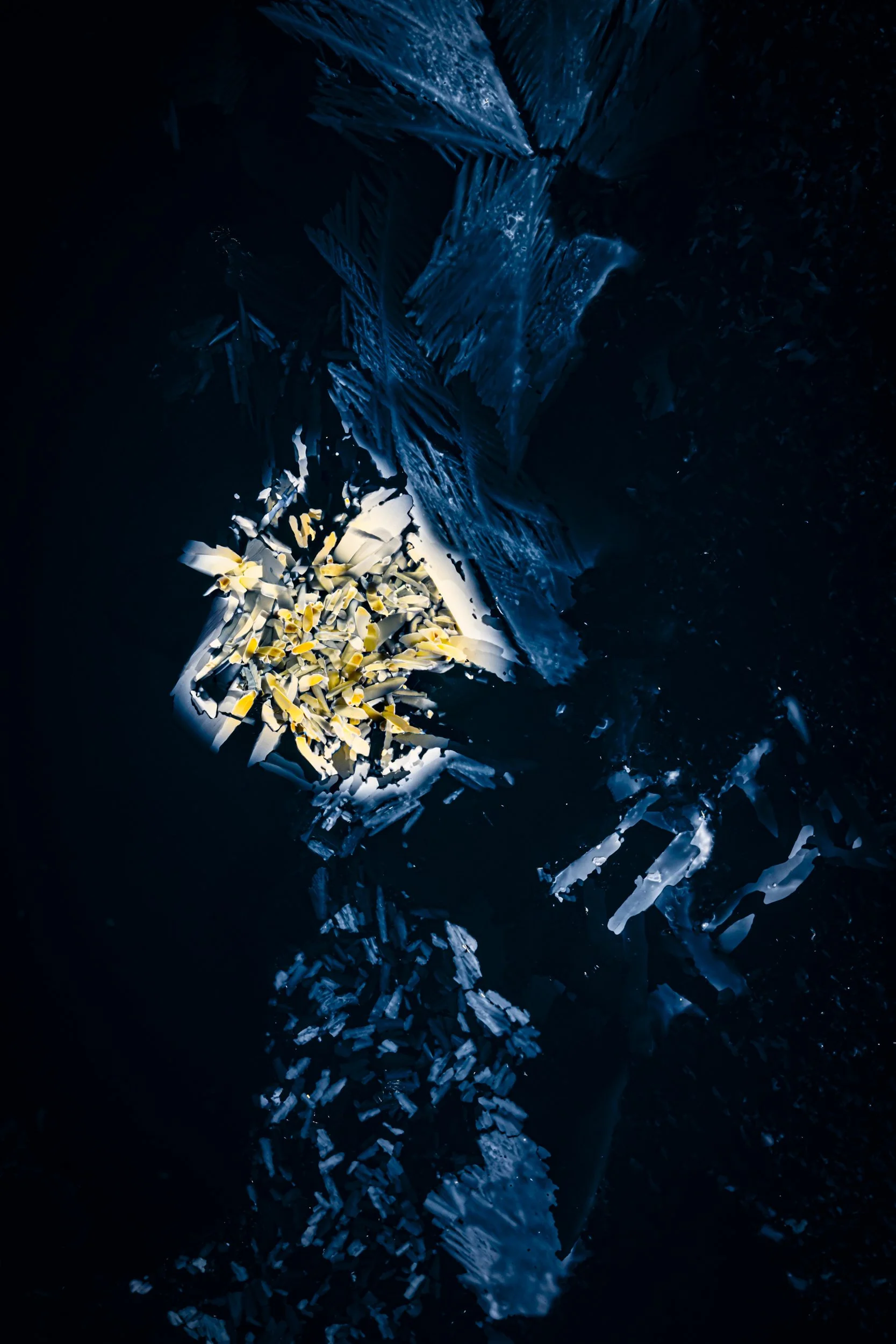 The abstract and colourful photographs show thin sections of ancient glacier ice and ultra pure water ice under cross polarised light.