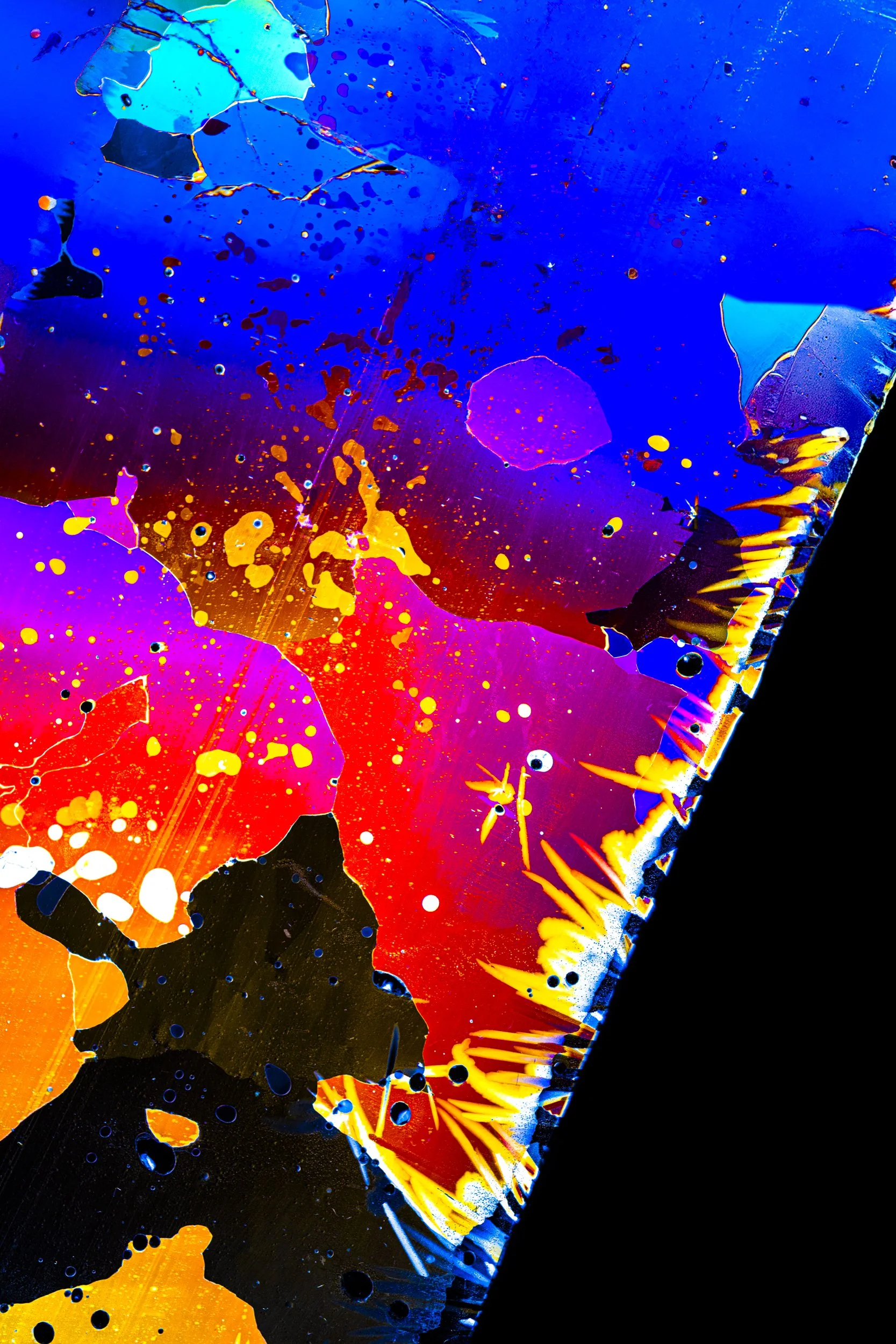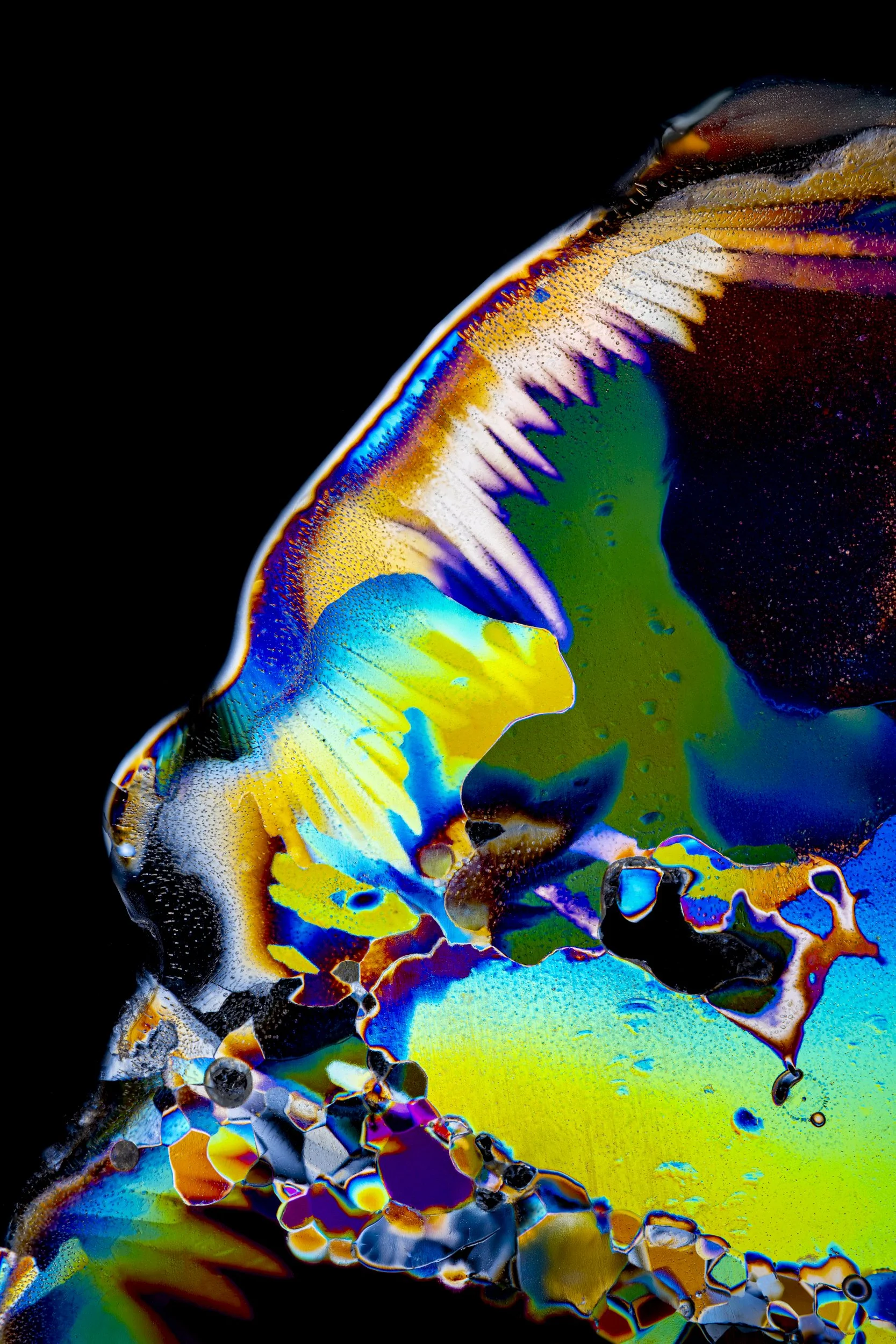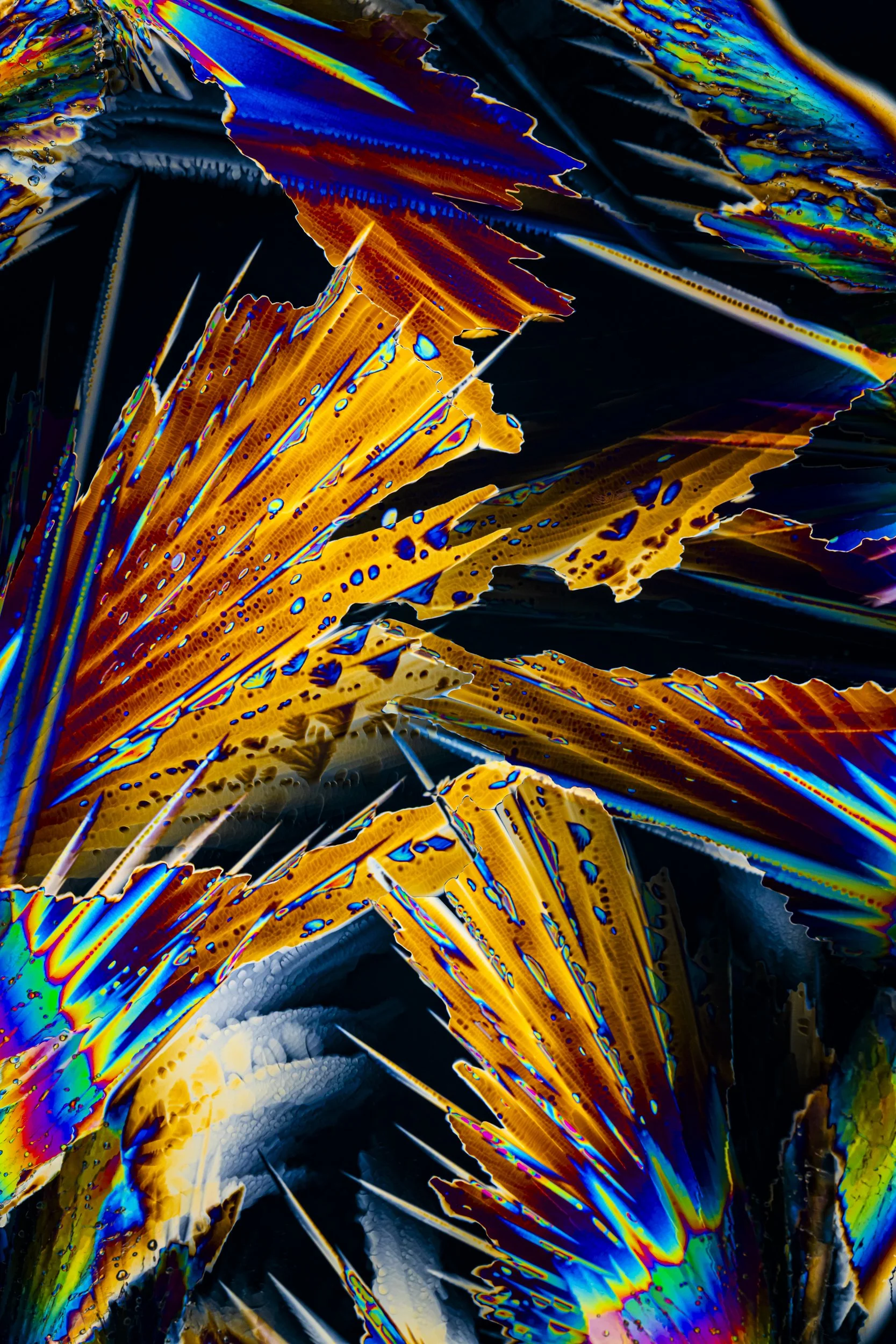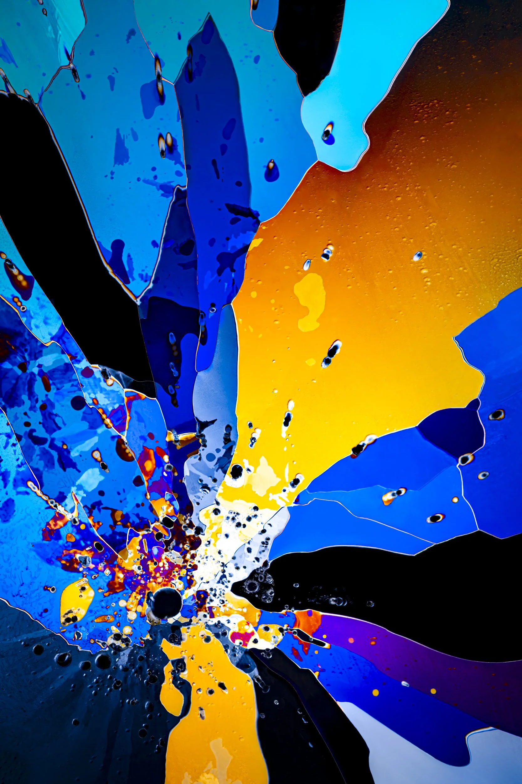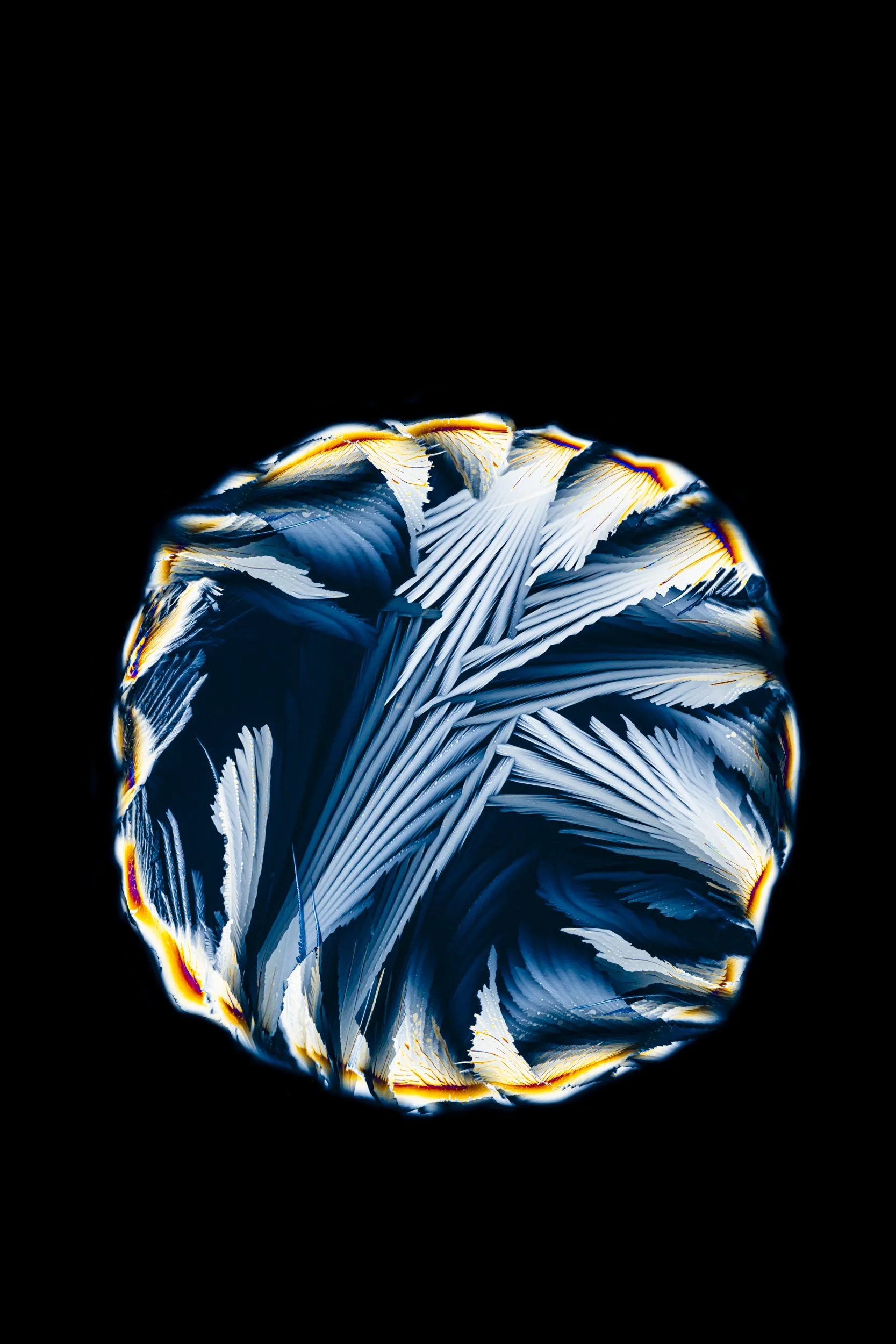The abstract and colourful photographs show thin sections of ancient glacier ice and ultra pure water ice under cross polarised light.